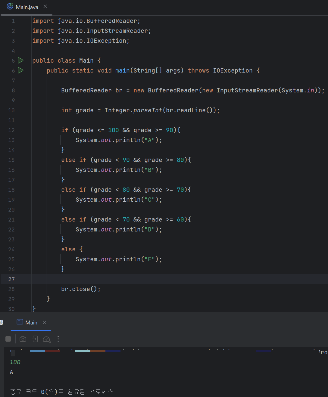 시험 점수를 입력받아 90 ~ 100점은 A, 80 ~ 89점은 B, 70 ~ 79점은 C, 60 ~ 69점은 D, 나머지 점수는 F를 출력하는 프로그램을 작성하시오.